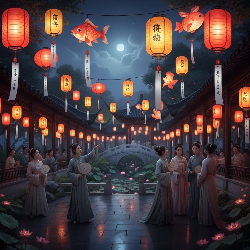 2) Загадки на фонарях — 灯谜 (dēngmí) и 猜灯谜 (cāi dēngmí)