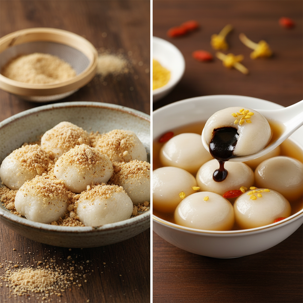 - 汤圆 (tāngyuán) — сладкие шарики в сиропе (часто юг)